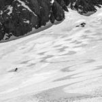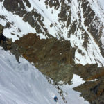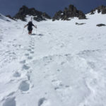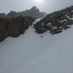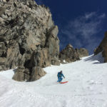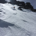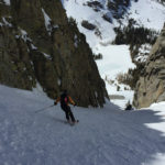 The snow on the ridge was firm but not too crunchy and it allowed us to easily traverse to the Glass-Yost Col at the base of the Hourglass. Normally, I prefer to take warm-up run down the powder of the “Chair 8 Trees” to upper Yost meadow to access the Hourglass (Yes, there was once a plan to put a Chair 8 in there. Wouldn’t that be amazing if they did that?!), or down the south face of June Mountain for a corn run, but the conditions were best to just beeline it and hope the wind would die down.