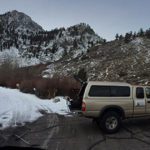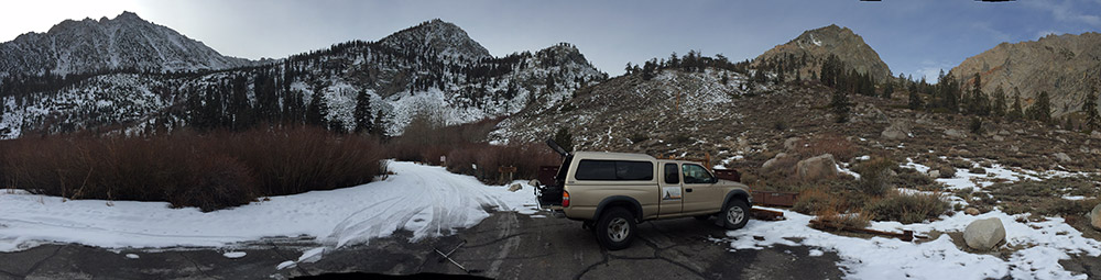 At this point the mountains are so incredibly dry for February. We did get a couple inches Fri-Sat that were enjoyable for some on and off of the resort, but not enough to even brag about on Instagram or Facebook apparently. On Thursday, I had a surreal experience. Drove up to the Onion Valley Trailhead at 9200′ and hiked a 40+ lb. resupply to one of our guides and friends, Justin Lichter, who is on a winter PCT thru-hike, up to Kearsarge Pass. Yes I hiked up there, with remorse but no regret. Skis would have been much more inefficient, and less fun. On the way up I ran into 3 people unexpectedly, not including my PCT hiker friends. 6 people from 3 groups all in the Kearsarge Pass area in late January is unheard of. Two of the people were friends conducting a monthly snow survey. They only brought 2 core tubes, and they could have done it with just 1, but they were afraid that 1 wouldn’t have enough weight to get the scale to register. The other guy I met was a Frenchman who had taken a bicycle from LAX airport up to Independence, then up to Onion Valley. He pushed his bike with road tires up the Kearsarge Pass trail a few miles then spent the night. His footwear was a pair of black leather sneakers like they make the checkout staff at Vons wear to work. I ran into him as he was starting his descent to bail from his original crazy plan, which was to push his road bike with his gear and supplies strapped on the back over the pass and down into Bubbs Creek to Cedar Grove, then back to LA to fly back on the 10th. All he had was a California road map, and it looks like a pretty good shortcut looking at that. The craziest part is that if his footwear was slightly better and not so soaked, he probably could have reasonably made it. Instead, I advised him that pushing over Highway 120 was probably a better plan, even if the mileage was greater. With my limited French language skills, I didn’t bother trying to explain our wilderness laws regarding bicycles.
