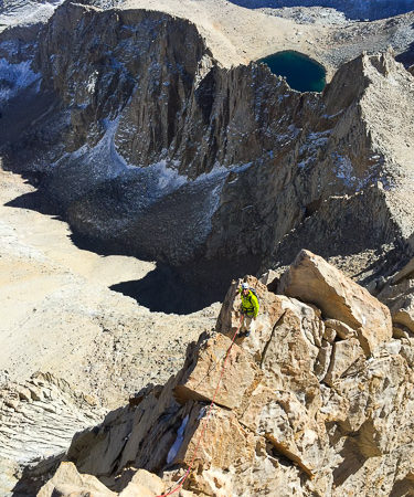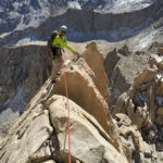 A conversation in Bishop with prolific Sierra rock pioneer Bob Harrington led me to invite one of our regular SMG guests to explore the Southeast Arête. First climbed in 1974 by Fred Beckey, Greg Thomsen, and Ed Ehrenfeldt, this is the ridge on the Sierra Crest that divides the drainages of Arctic Lake from the “North Fork of the North Fork” of Lone Pine Creek. This ridge is accessed quite easily via Iceberg Lake and Whitney-Russell Col, but it is arguably nicer, just as efficient, and far less populated to hike up the drainage above Upper Boy Scout Lake toward the Southeast Face of Mount Russell. From below the Southeast Face it is easy in snow-free conditions to traverse to the northernmost col via class 3-4 and directly to the start of the route. Ascend from the near the toe of the ridge via any number of nice start variations. The climbing on the ridge is largely on coarse and knobby alpine granite that starts with enjoyable easier pitches that do not feel very far off the ground. As the guidebooks point out, it is easy to escape the lower route with a short rappel or downclimb to the west. In one spot about 1/3 of the way up you can literally walk off into the sand and bail, but this is where the fun climbing on the ridge begins! The rock becomes more compact and solid, and the route becomes surprisingly complex, presenting many options. The best line stays closest to the ridgecrest and weaves around sharp spires up excellent yet short finger and hand sized cracks, flakes, and blocks that sometimes involve steep and committing moves, yet never feel stiffer than 5.9. As the ridge ascends past the halfway point, escape becomes a bit more involved but only slightly more so than from a climb like Matthes Crest in Yosemite. The route continues up some fantastic and airy pitches along the exposed edge of the Southeast Face and the steep drainage that leads down to Upper Boyscout Lake. The ambience is arguably finer than on the south and southwest facing routes, and perhaps has some of the very best viewpoints that can be found anywhere on the mountain. Expect to do at least one very short rappel along the way at a break in the ridge. Finish via a finger crack that leads to just below the east summit. Tag the east summit for sure, and consider going over to the true west summit too, then enjoy the fun descent down the East Ridge and the Russell-Carrillon Col to return to Upper Boy Scout Lake.