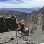 The next morning dawned clear and we made our way up to the base of the route, which involved a short steep snow climb before we exited onto the rock. As we roped up and shouldered the rack it was easy to see the path we would take. To start the technical climbing on the route we would have to engage a steep corner with a chimney! After the initial pitches were in the books we continued up through a sea of slabs, cracks, corners and towers. The ‘crux’ climbing didn’t seem that significant when compared with the tyrolean traverse used to pass a 15 foot gap blocking our way. After a seemingly endless series of towers the terrain finally eased off and we were able to scramble up to the summit with views of the Palisades stretched out in front of us.