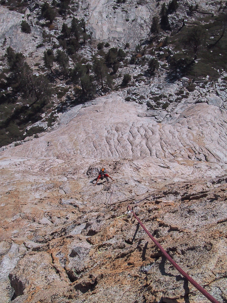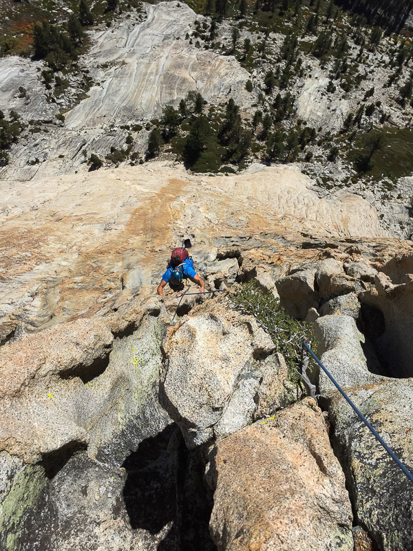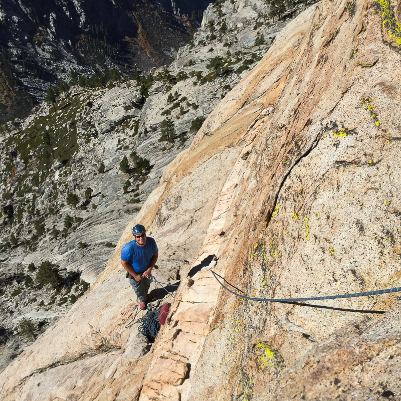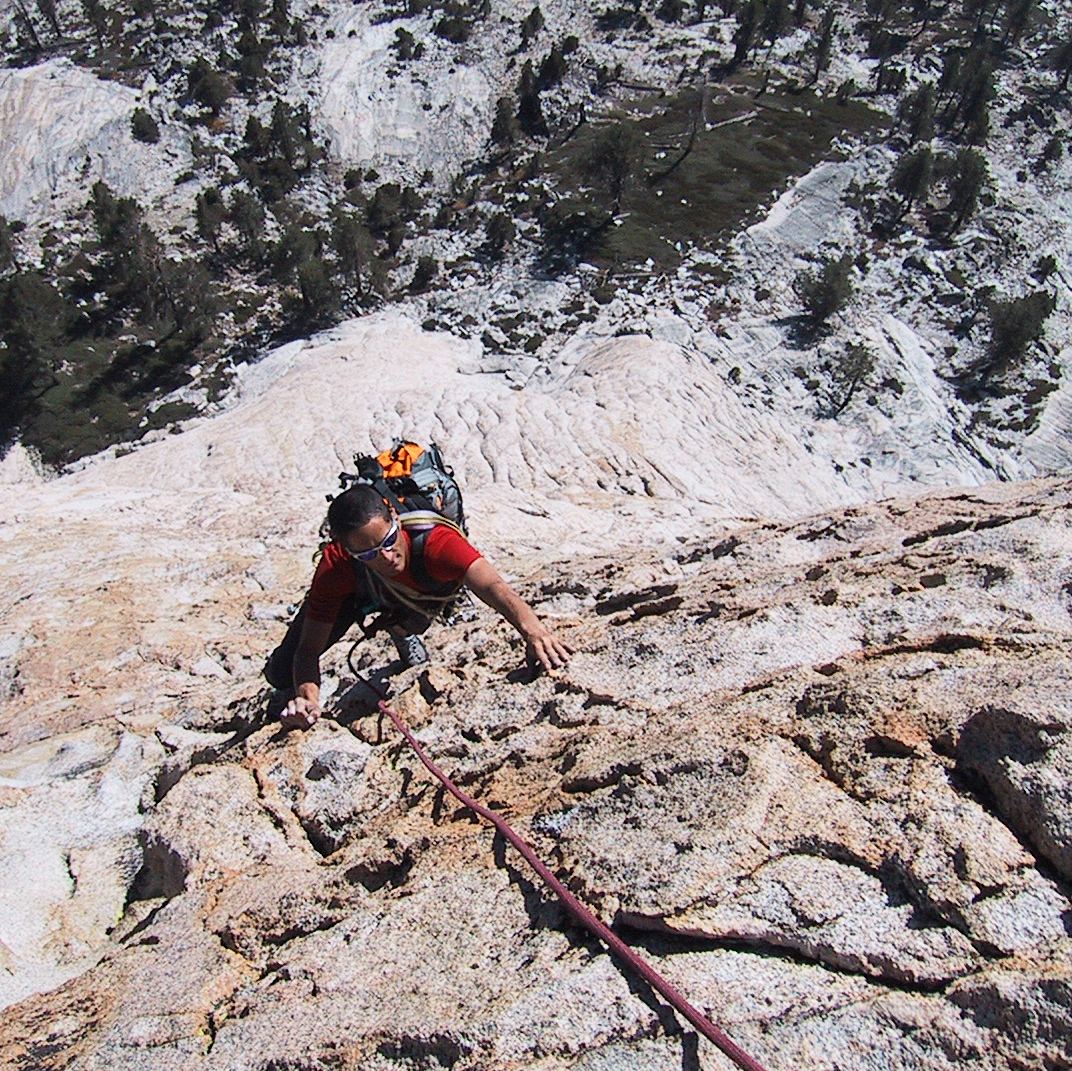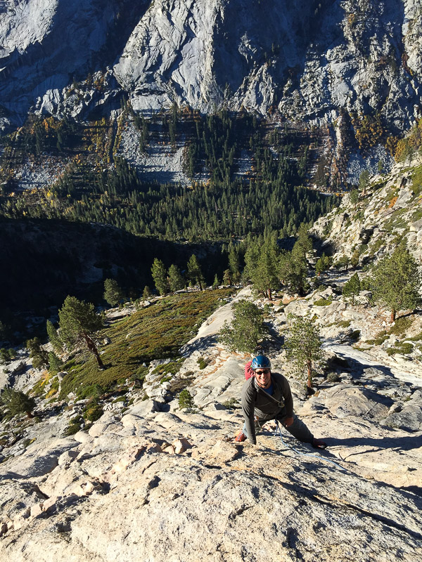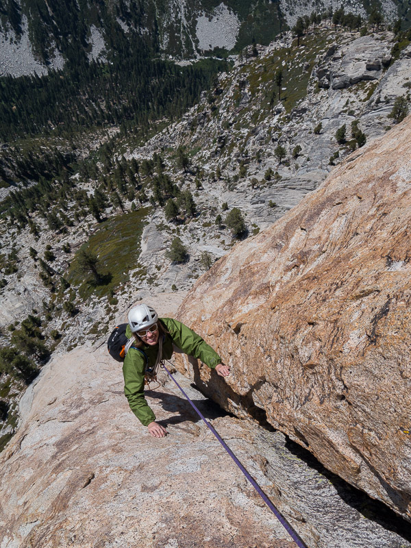 This 12-pitch rock climb is located right in the heart of the range in Kings Canyon National Park. The base of the South Face is situated 2000 feet above the confluence of Charlotte Creek and Bubbs Creek and the summit is a modest 10,690 feet above sea level. This configuration gives the climb an alpine feel but with the pleasant comforts of subalpine weather, all day sun-exposure, sheltered camping, and increased blood oxygen levels at lower altitudes. When there is snow in the high country, this climb is often still in excellent condition, making it a good choice for the shoulder seasons of early summer or fall. The price of admission is a 12-mile approach hike that includes a climb over Kearsarge Pass and takes most of a day. Unlike with many Eastside approaches, the return trip is just as long and strenuous. No – approaching from the west is even more difficult (in case you were wondering) and the camping situation is not nearly as ideal. The remoteness and inacessibility offers the benefit of leaving the climbing crowds closer to the road in places like Yosemite and Tuolumne and Mount Whitney. Charlotte Dome remains pristine and wild, despite being listed for decades as one of Steck and Roper’s “50 Classic Climbs of North America.” Relatively few people are willing to make the trek in to climb this juicy peach of a route, but a great many who do consider it the best climb of their lives.