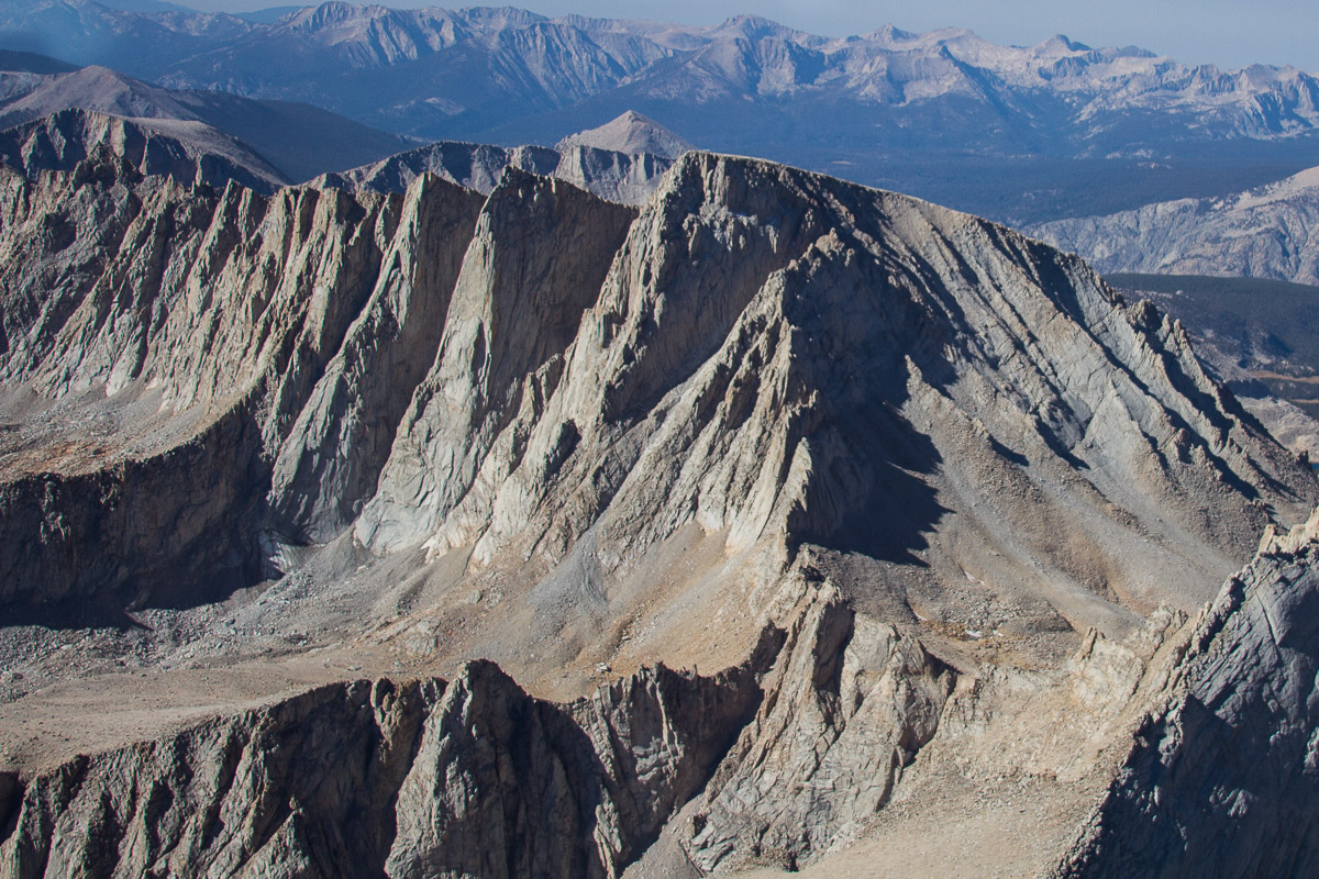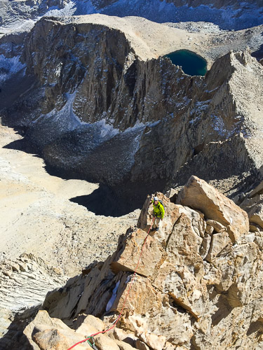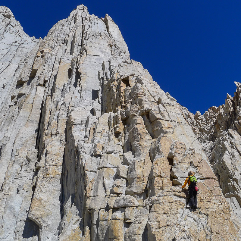 Two great 14’ers in one outing. This trip gets the High Sierra Value Award for quality and quantity of perfect granite climbing. “Why just climb one fourteener when you can climb two?” After an outstanding climb of Mt. Whitney’s East Face or East Buttress, consider adding Mt. Russell while you are there. Overshadowed by Mt. Whitney, Mt. Russell often gets overlooked, but this granite giant has dozens of world-class routes to choose from and no hiker’s path to the top. For those that can climb at the 5.9 grade, we recommend the Fishhook Arete, in our opinion without doubt the proudest and most aesthetic line on the peak. First climbed by Norman Clyde in 1926 Mt. Russell was one of the last California Fourteeners to be climbed. In the 1927 Sierra Climb Bulletin Clyde wrote: