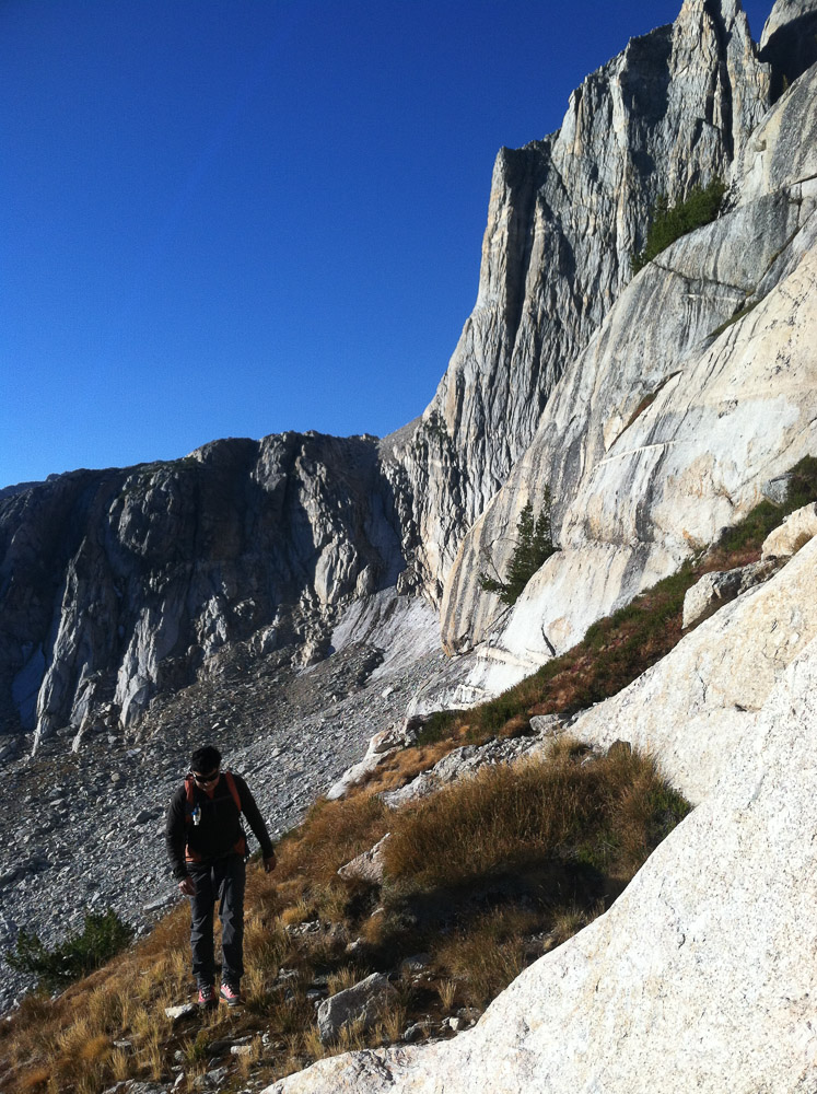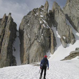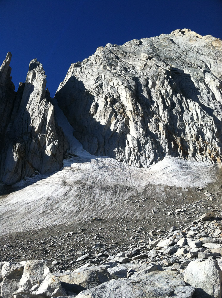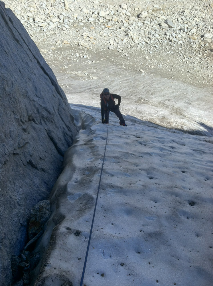 North Peak is a unique and special alpine peak of the Sierra. The three North couloirs hold fantastic alpine neve and later in the season, pure alpine ice. The climbing is perfect. The right couloir is the most consistently good and it averages just over 50 degrees, which feels plenty steep when the ice is bullet hard, but there is a bergschrund that to cross often involves near vertical ice climbing. It is around five pitches long and at its top you emerge into the sun and climb pleasurable 3rd and 4th class rock to the plateau just below the summit. At that point, welcome to the scenic boundary of Yosemite National Park!