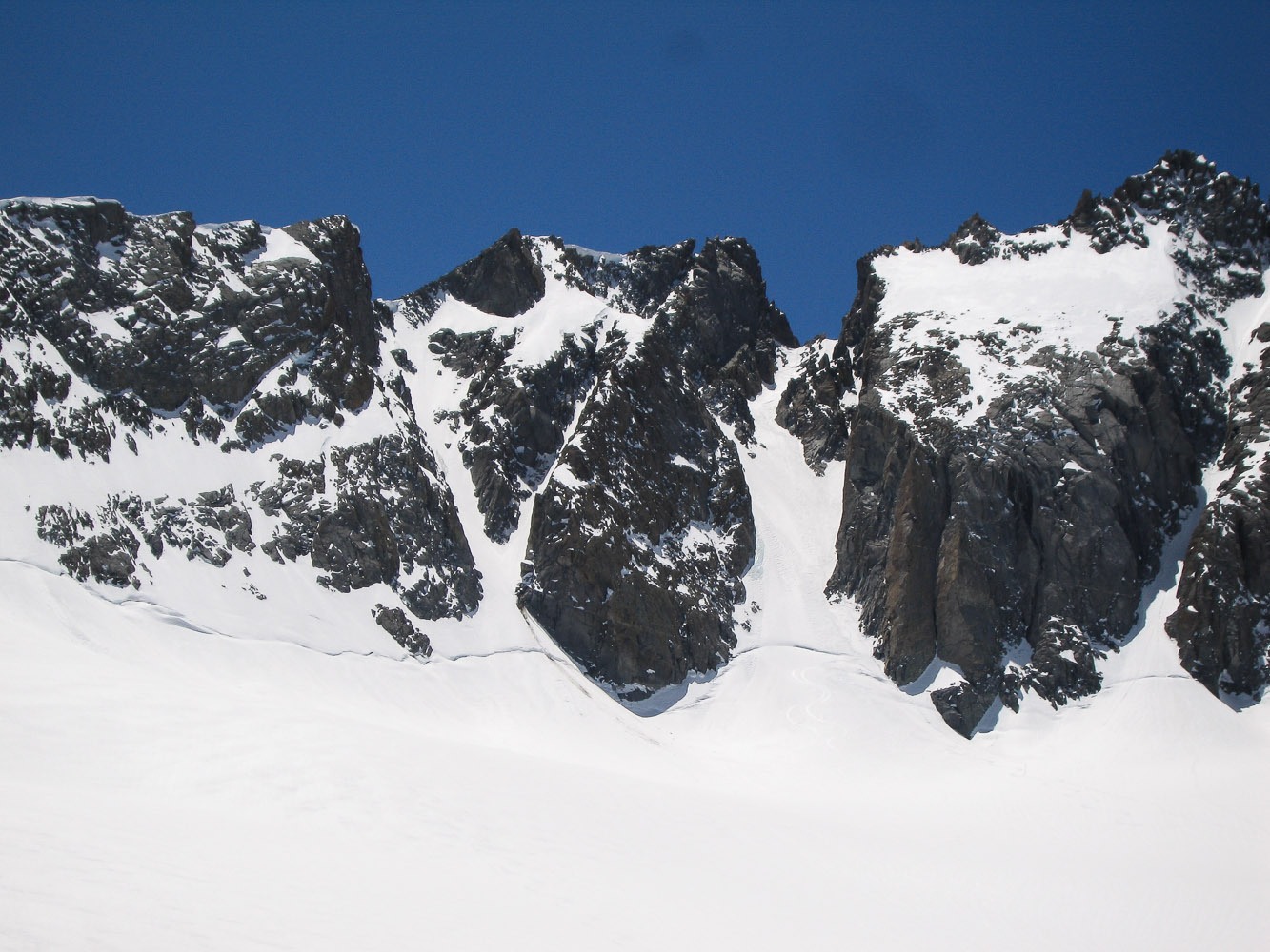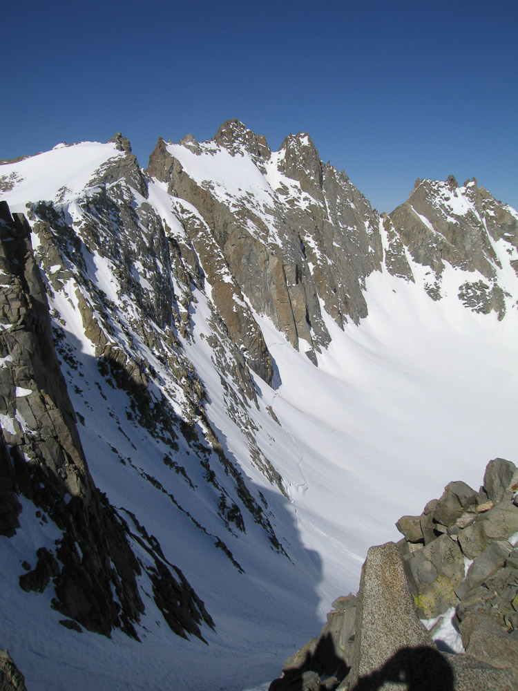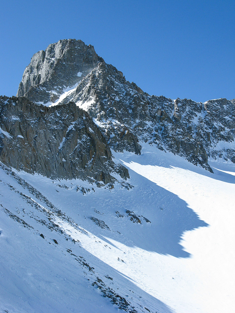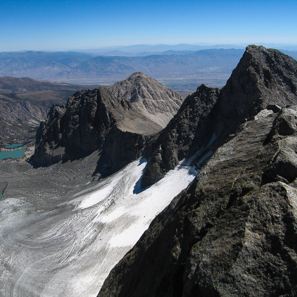 On this five day program, we plan to climb several of the ranges breathtaking peaks using skills and equipment for classic alpinism. This side of the mountains usually requires use of crampons and 1 or 2 ice axes, in addition to the use of the standard climbing safety equipment (ropes, harness, helmet, rock protection, ice screws, other hardware, etc.). There are 10 major peaks that surround the Palisade Glacier and 5 of them have summits above 14,000 feet: Mt. Sill, Polemonium Peak, North Palisade, Starlight Peak, and Thunderbolt Peak. Each climb has distinctive challenges but all of them require good all around skills (rock, ice, snow), and good physical condition. We will have 3 full climbing days to climb as many quality routes and summits as possible.