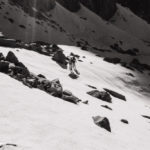 The next morning we woke early and after hot drinks and some breakfast cruised up the final slope to Thunderbolt Col. Often times this is steep and blocky but our morning hike was on nice frozen Styrofoam neve snow that took a crampon and required little effort to ascend. We quickly reconfigured to harnesses and helmets at the Col before entering in the Southwest Chutes #1. We spent a few hours walking up the firm snow in crampons with one technical pitch of rock. At the top of the couloir the large boulder that we often tunnel under was buried and we had to mantle on top of it to get a view of the final pitch before the summit block. I was happy to have a belay as I plugged in gear before doing exposed moves in crampons to avoid wallowing in the snowed in cracks. Bernd and I belayed from a flat ledge below the summit block. As Jimmy and Jack gazed across at the snow covered ridgeline we discussed our options. It was a really neat opportunity to do a wild alpine traverse with Alaska or Patagonia style conditions, but in California sunshine and temps. Due to the fresh snow we would be climbing that day to the notch between and up to Starlight and the bivy sites on North Palisade. The combination of Jack’s cold fingers, Jimmy’s onset of acute altitude illness, and the 30+ pitched out sections of climbing mixed rock and snow terrain in crampons ahead led to the ultimate decision to turn back in favor of climbing warm, dry rock at lower elevations.