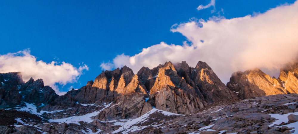Our plan was to camp right near Thunderbolt Col on the west side of the Palisades, but due to the high winds and an unappealing thought of digging out a snow platform, we opted for camping about 30 minutes below the col at a flat bench below Mt. Winchell in stunning Dusy Basin. The wind sheltered camp was a great place to view the constant clouds ripping overhead that seemed to remind all of us of watching a very high speed time lapse video. Once we had finished our dinner and water was filled for the morning we hunkered down in our tents as the temperatures dropped below freezing overnight.