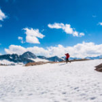 Clear skies turned to isolated clouds ripping across the crest as we hiked into the snowline, and after some elevation gain we were kicking steps in the new snow.