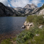 We met in Bridgeport at 6am, packed up, grabbed a coffee and a quick breakfast in town, and drove up to Twin Lakes. We were able to get on the trail by 7:30am. The Robinson Creek trail is mellow and scenic to Barney Lake. From there the Eastside high desert landscape meets that of Yosemite and you get a first scope of The Juggernaut. The trail through Robinson Lakes and Crown Lake winds around lakes and small granite terrain features so the mileage and gain feels more than the map would indicate. The Mountain Project guide estimates 3-3.5 hours approach time to the base of the routes, but with reasonably lightweight overnight packs, a strong and steady pace, and two 10-15 minute breaks on the trail, we logged closer to 4.5 hours to camp and another ~30 minutes from there to the base of the left side climbs (to the ledge above the class 3-4 section).