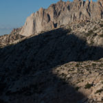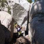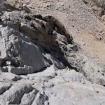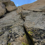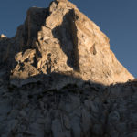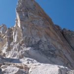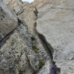 After the second climb on Juggernaut, with loose rock and sandbag ratings, and considering we planned to climb and hike out on day 3, we decided to leave the other routes on Juggernaut for another trip. The Arch Rival route and Irresistible Force both look attractive. There are at least a few other proud lines on the face to be pioneered for sure. We instead turned our attention to Crown Point and its Peeler Pillar. This is the obvious other climbing feature seen on the skyline from Barney Lake. It is about the same size as the Juggernaut but perhaps a little bit steeper on average on the main north face. Secor’s guide describes a 5.6 line and 5.8 variation on the right hand, northwest facing side. We decided to recon hike and maybe climb if our fancy was stricken. After a nice hike to the base, we found the established old line, more or less, and climbed 4 pitches to the top of the pillar on nebulous and grainy stone to around 5.7 that got better and more enjoyable with elevation. The line goes up the white scar of an obvious and ginormous rockfall event and has different geology from the north face proper, which has stone more akin to The Juggernaut, with less vegetation in the cracks.