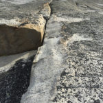 The next pitch was more grain, loose, and vegetated. We dropped a mini fridge sized block off the route here. A nice steep corner could use a #4 cam (which we did not bring) at the psychological crux and I had to make scrappy 5.10 moves on crappy rock above tiny wires. One of the highlights of the route though was climbing through the triangle roof, a major identifiable feature of the wall with beautiful green lichen and exciting 5.9 hero moves. 2 more pitches of loose, blocky 5.6-8 climbing lead to the top. I would recommend considering a new connecting line after the roof (looks reasonable) over to the big ledge and merging with the last pitch of the Dihedral Route.